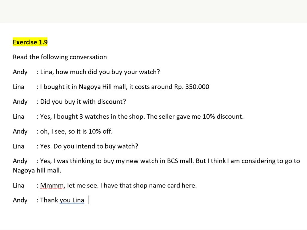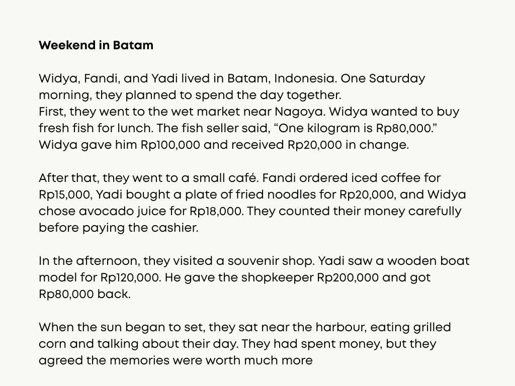 - Participants understand and can use English to tell the amount of Indonesian currency