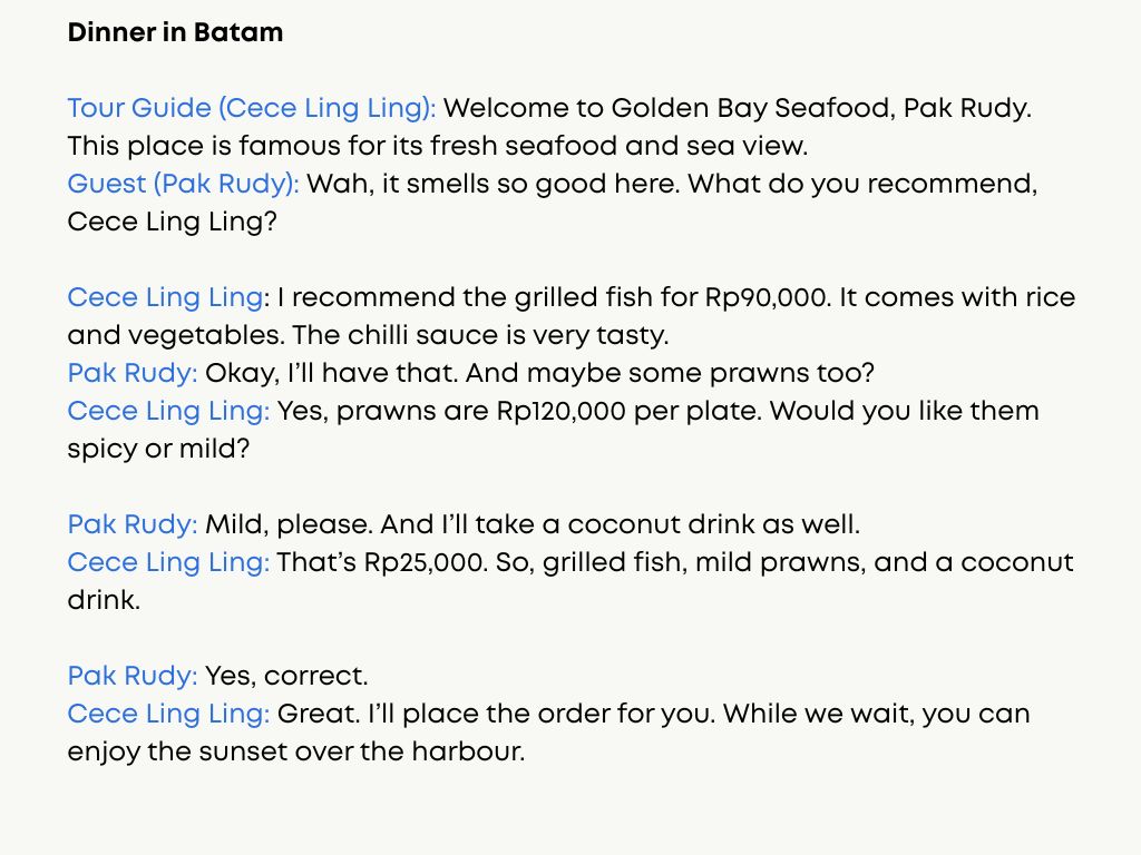 Participants are tourist guides in Batam island, Indonesia. Lessons are only for tour guide with license. Thus those who already have English as their qualification are not allowed to join this training.