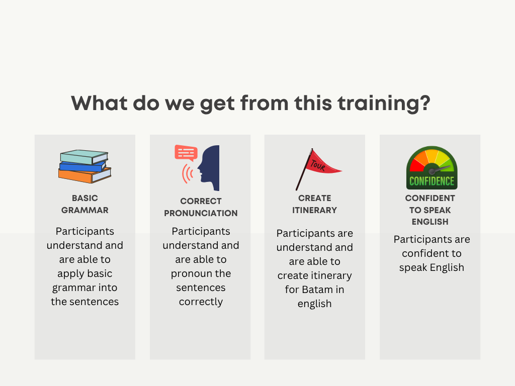 - Participants understand and can spell their name, and name of popular destinations in Batam island